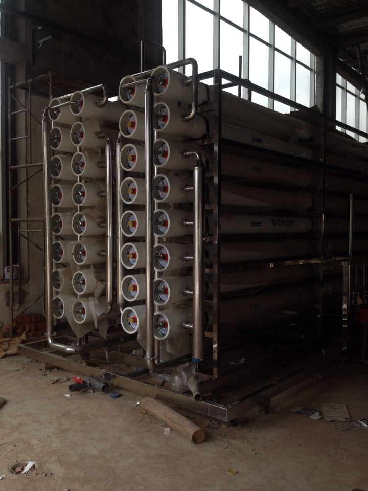 系統各個連接到位后,進入調試階段。把原水泵,高壓泵,備用的旋鈕開關打到OFF位置,把砂濾碳濾上的手動多路閥打到正洗反洗狀態,把高壓泵前的系統低壓保護開關用螺絲刀調至常閉,(這步需懂電路人士調)開進水,開電源,確定有水后開一下原水泵立即關閉,立即查看水泵的轉向是不是同泵體上的箭頭方向一致,如相反請調相正轉,高壓泵也如此調試,(此調試針對380V的系統)220V的系統無需調相調試,方向調好后進入下一步調試,把原水泵開關打開把砂濾上的多路閥打到正洗,即多路閥中間位置,反洗在多路閥右邊。運行在多路閥左邊,利用正洗反洗把石英砂洗干凈為止(排水口水清即可)然后把多路閥打到運行,進行碳濾清洗,碳濾清洗也如同砂濾清洗,洗干凈為止,再打開濃水閥(即濃水流量計進后的不銹鋼球閥,把進膜總壓力閥(即高壓泵出水位置的不銹鋼球閥關二分之一,再開高壓泵清洗膜,此時濃水流量計應沖到頂部位置,待排水口水清(剛開始膜的清洗排水位乳白色)排水口水清之后進行水質調節,慢慢關濃水閥此時面板上的膜前壓力后膜后壓力隨之慢升高,注意濃水閥切勿關死,500L調至純水流量到9L/分鐘的位置,(250L系統調至5L/分鐘,1000L系統調至20L/分鐘)此時水質偵測的電導率會慢慢下降直至穩定,就是系統最佳產水水質,注意:膜前壓力和膜后壓力一般調到8KG左右,最高不要超過10KG,系統正常調節為濃水和純水是1:1,根據客戶的需求也可適當把濃水調小,但禁止全關閉,膜前壓力和膜后壓力由上述的兩個不銹鋼球閥控制,客戶可自行嘗試 ,但要注意壓力控制10KG以內,電導率的讀數一般在20us-cm以內,但要根據當地的水源來定,水源好電導率就低。系統壓力,產水,水質穩定后就是最佳運行狀態,此時可以設點高壓泵前低壓保護,壓力一般設置在1KG,低于則自動控制就會報警停機,系統每次開機和連續運行2小時都會自行沖洗90s,沖洗時沖洗電池閥打開水全部排走,無純水產出。膜前壓力和膜后壓力只有1GK以內的壓力。90S過后沖洗電磁閥回自行關閉此時壓力和流量都會達到之前的最佳工作狀態。沖洗時不要盲目操作其他開關和閥門。自動控制內還提供原水箱低水位報警和純水箱高水位報警供客戶自行連接,請參考自動控制器說明書,關機先關電在關水,開機先開水在開電。