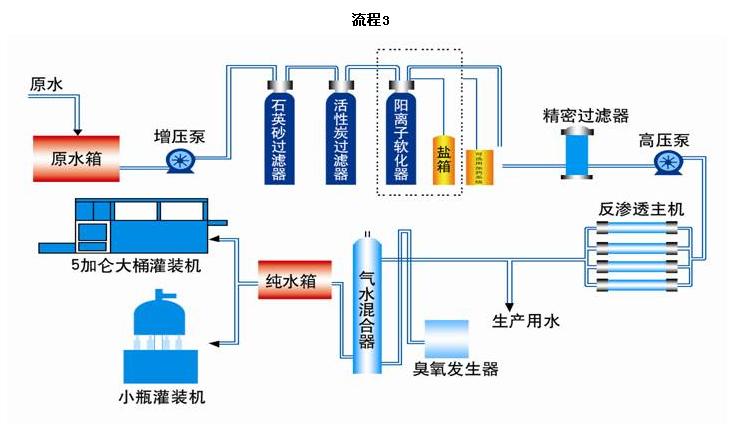 原水→原水箱→原水泵→多介質(zhì)過濾器(石英砂過濾器)→活性炭過濾器→軟水處理器→精密過濾器→高壓泵→一級反滲透(RO)裝置→純凈水箱→高壓泵→二級反滲透→紫外線裝置→用水點
