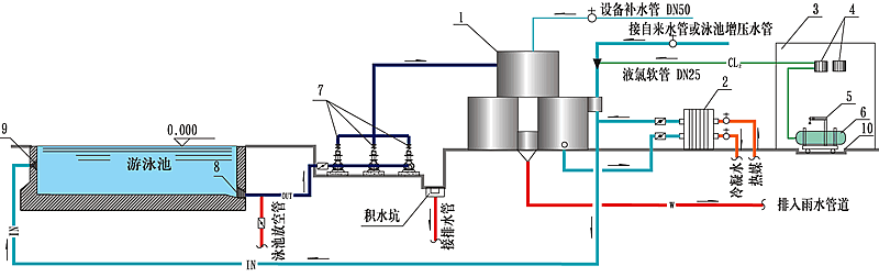 1)整個泳池恒溫加熱系統需要與泳池整套水處理系統連接使用;(2)以上冷水、熱水、回水、380V電源均在1米接口范圍內