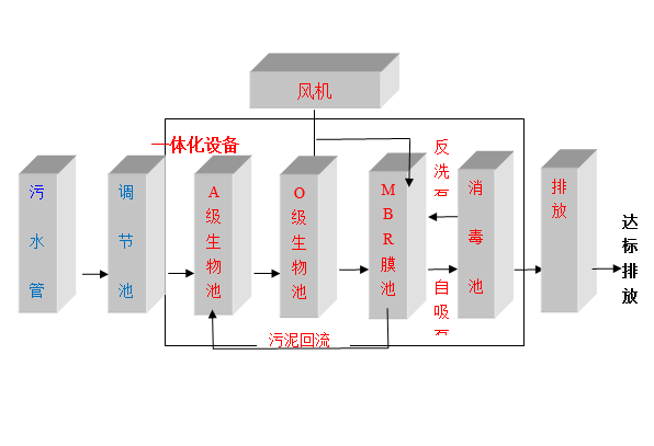 本一體化污水處理設備。工藝描述如下:接自污水管網的污水經過調節池均質、均量后,通過提升泵輸送到一體化污水處理平臺。一體化處理平臺經過厭氧、好氧及MBR膜+消毒后,然后達標排放。工藝流程圖如下: