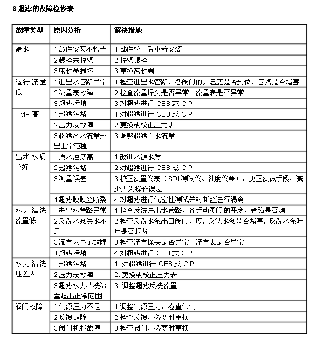 8 超濾的故障檢修表
