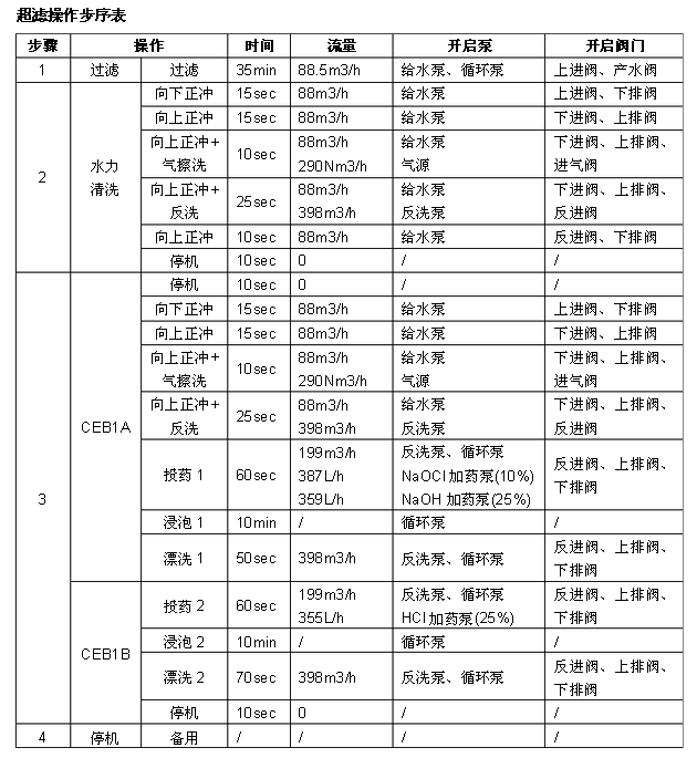 (1) 超濾“投運”后,應(yīng)在“過濾”、“水力清洗 HC”、 “化學(xué)加強反洗 CEB”之間切換。即超濾在“過濾”、 “HC”之間循環(huán)進行 20 次后,進行 1 次 CEB。