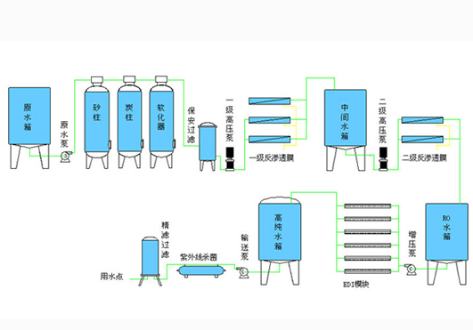 EDI增壓泵 ← 二級(jí)純水箱 ← 二級(jí)RO主機(jī) ← 一級(jí)純水箱 ← 一級(jí)RO主機(jī)