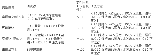 不同的膜生產廠商對上述污染物采用的清洗藥劑不完全相同。具體的清洗方式或專用清洗劑參照膜廠商的技術手冊。但一般來說,酸清洗除去無機沉淀物如金屬氧化物、碳酸鹽,pH值調至2~4;堿清洗除去有機物、微生物,一般pH值調至10~12。常用化學清洗試劑如下。